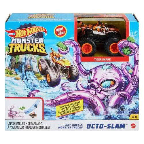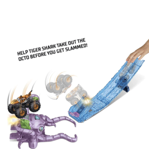 ערכת המשחקים של הוט ווילס מונסטר טראקס מסלול תמנון מאפשרת לילדים לנהל קרב 'תת מימי' בין תמנון ענק שזורע הרס מתחת לגלים לבין הטורף האולטימטיבי שלו, טייגר כריש – בצורת משאית מפלצת!