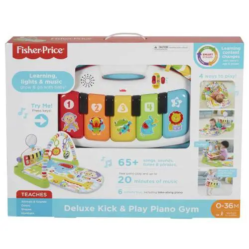 אוניברסיטה פסנתר לפעוטות Deluxe Kick and Play, הכולל חמישה מקשי פסנתר מוארים, קשת צעצוע הניתנת למיקום מחדש וארבע הגדרות מוזיקליות. שנה את רמת המוזיקה והלמידה ככל שהתינוק שלך גדל. טכנולוגיית Smart Stages מאפשרת לך לשנות את תוכן הלמידה כך שיתאים לגיל ולבמה של תינוקך כדי להתקדם מזמן הבטן לישיבה ליד הפסנתר. תווי פסנתר אמיתיים מעודדים את ילדכם ליצור מנגינה משלו. נתק את המקלדת לנגינה תוך כדי תנועה. חדר הכושר מספק צבעים בהירים, מרקמים, שירים, צלילים וביטויים כדי לעורר ולערב את החושים המתפתחים של ילדכם. תינוקות בועטים, מושיטים יד ודוחפים למעלה כדי לפתח את המיומנויות המוטוריות שלהם. פעילויות מתגמלות כמו לחיצת מקשים ושמיעת מנגינות גורמות לתינוקך לחזור לעוד. מחצלת הניתנת לכביסה במכונה כוללת מראה לגילוי עצמי, נשכן של פילים, פנדה מקומטת, רעשן אריה וצלצול מצלתיים של קופים.